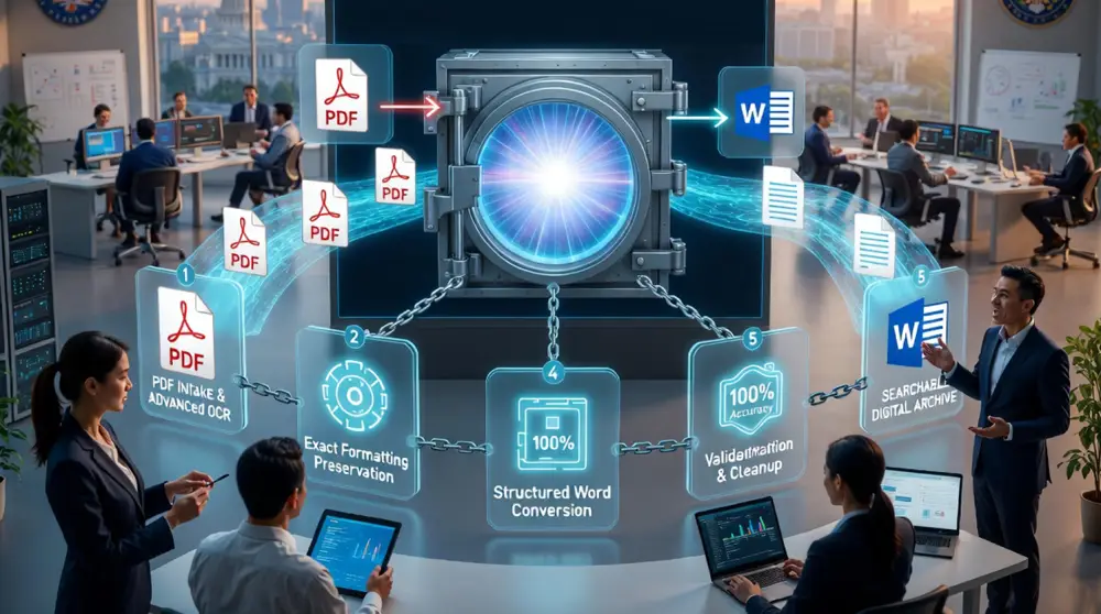 A government body had 1,000 critical policy and governance documents locked in non-editable PDF formats. These documents contained complex tables, nested lists, and multi-column layouts that needed to be converted into structured, editable Word documents. The challenge was maintaining the exact layout and content accuracy required for legal governance.